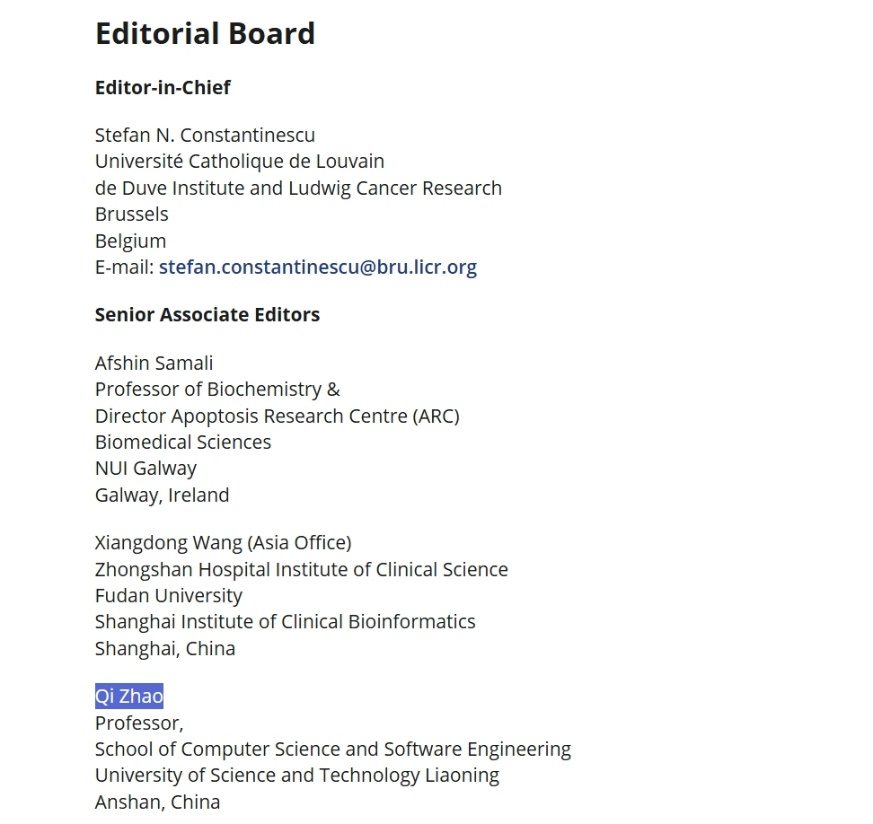 近日,多宝官网计算机与软件工程学院赵琪教授收到比利时皇家医学科学院院士、罗马尼亚科学院院士、欧洲医学科学院联合会副会长、比利时鲁汶大学Stefan Constantinescu教授邀请,受邀担任威立出版集团旗下期刊Journal of Cellular and Molecular Medicine高级副主编(senior associate editor)。该期刊的高级副主编共有三人,另外两位分别是欧洲人文和自然科学院院士、复旦大学特聘教授王向东,爱尔兰国立高威大学资深教授Afshin Samali。