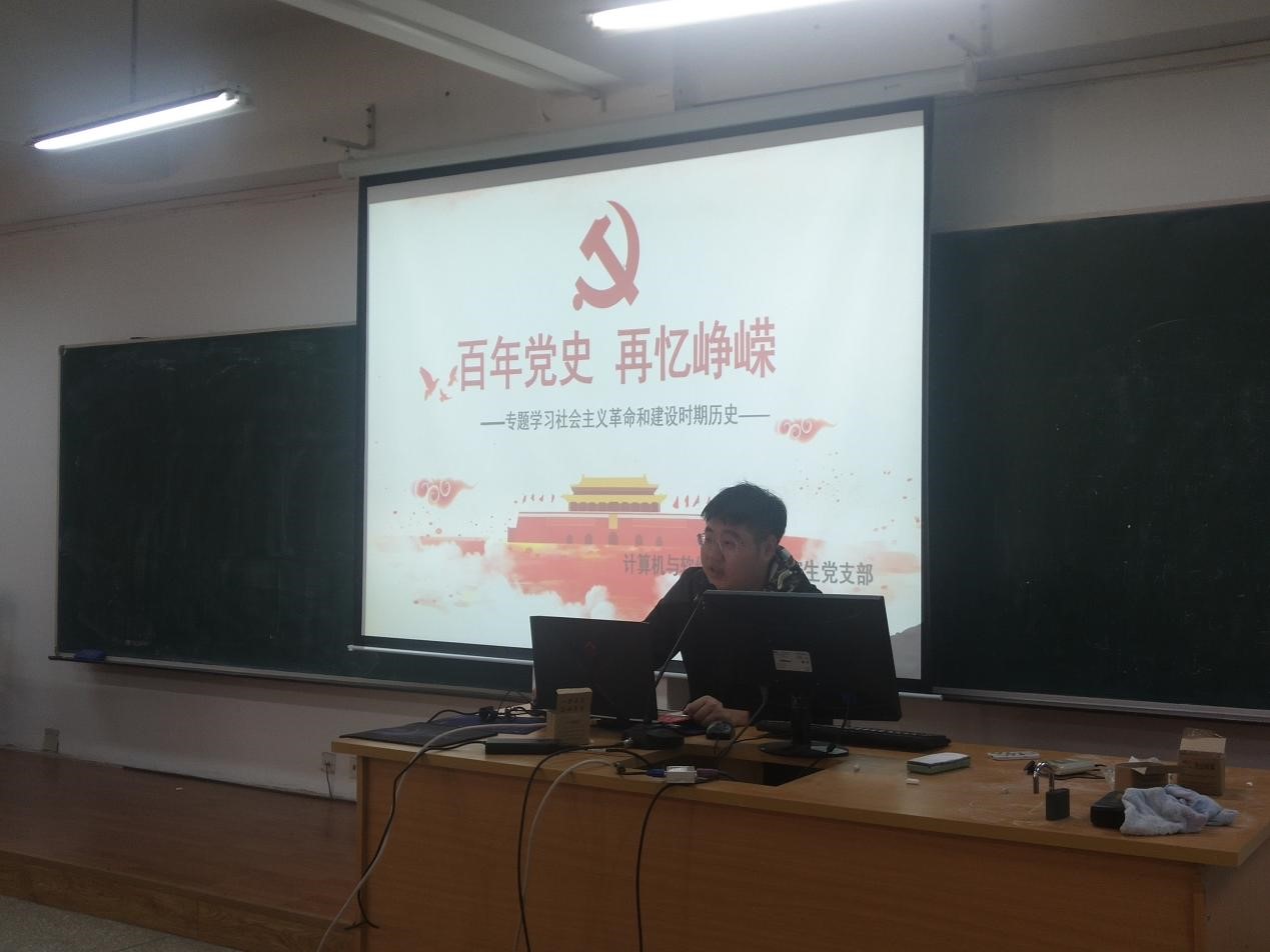 会议伊始,党支部书记张欢就《关于在学校党史学习教育读书班中进行四个专题学习的通知》第二专题学习内容做了详细的传达,并对第一专题学习的内容进行了简单的回顾。接着,党支部党史第二学习小组成员陈子健对社会主义革命和建设时期的历史进行了领学,学习内容主要围绕“党在社会主义革命和建设时期的奋斗历程”、“实现新民主主义向社会主义过渡”、“对社会主义建设道路的艰辛探索”以及“对中国特色社会主义道路形成产生的重大影响”四个方面展开,带领支部成员进行了深刻的学习。