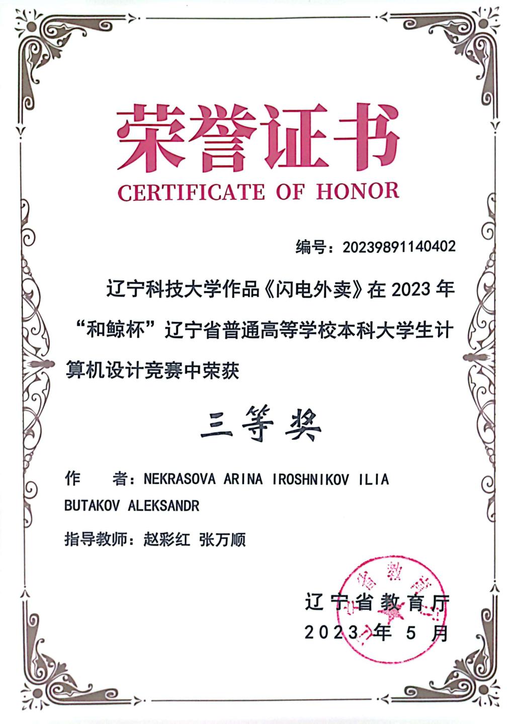 近日获悉,我院留学生NEKRASOVA ARINA、IROSHNIKOV ILIA、BUTAKOV ALEKSANDR在“2023年中国大学生计算机设计大赛”中取得省赛(暨2023年“和鲸杯”辽宁省普通高等学校本科大学生计算机设计竞赛)三等奖的好成绩。作品《闪电外卖》用留学生的视角介绍中国外卖现状,讲述透过外卖看到的中国发展速度,以及中国人感恩自然,尊重劳动者,爱惜食物,重视亲情,勤劳奋进的精神风貌,有助于观者更深刻地理解当代中国。
