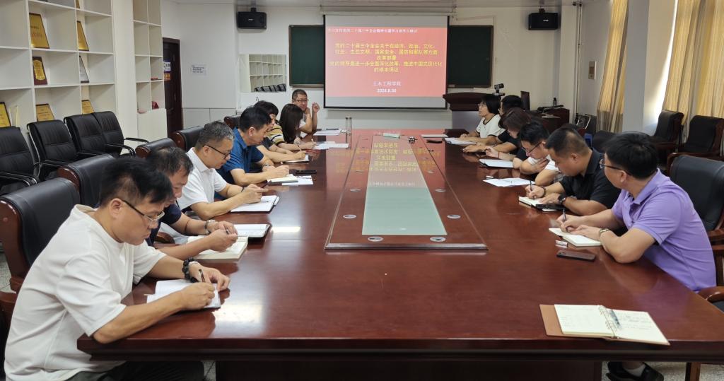 8月30日,按照学校学习宣传党的二十届三中全会精神学习班安排,围绕“党的二十届三中全会关于在经济、政治、文化、社会、生态文明、国家安全、国防和军队等方面改革部署”和“党的领导是进一步全面深化改革、推进中国式现代化的根本保证”两个内容,多宝官网学习宣传党的二十届三中全会精神学习班组织开展第二次学习研讨。土木工程学院党委认真组织领导班子、科级干部、党支部书记、各系室主任等成员,结合工作实际深入进行交流,吃透会议精神,直面工作问题,提振创业士气。