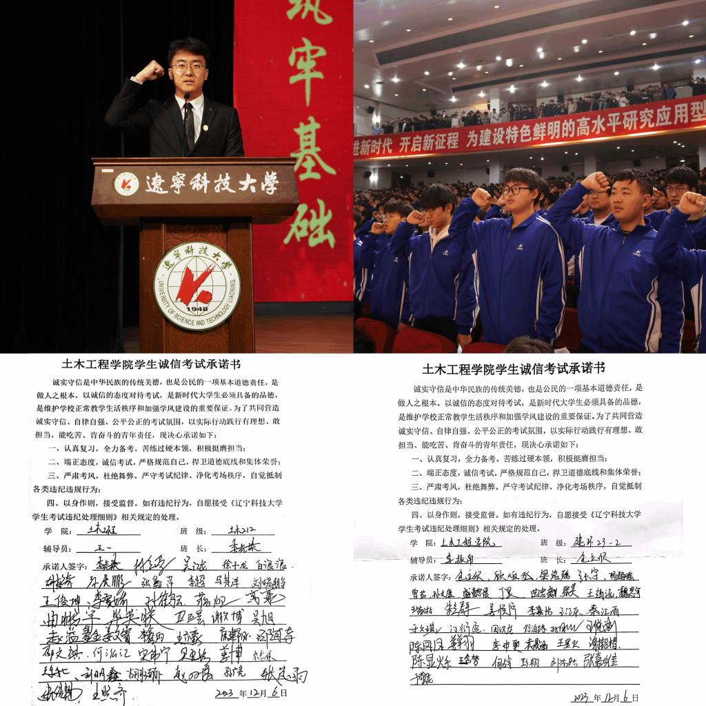 2023年12月8日,学院召开学风建设表彰大会暨教风学风建设启动会,学院院长周卫红作题为《教风学风联动,提高学生培养质量》动员讲话,高华国副院长作题目为《潜心教书、用心育人,将教风促学风向纵深推进》的“三全育人”经验分享,院学生会执行主席徐浩哲带领全体同学宣读《诚信考试承诺书》,学院1391名本科生签署的承诺书在大屏幕滚动。12月19日,学院面向全体教职工召开期末考试培训暨工作布置会,规范考试过程管理,强化监考教师的责任意识。2023年12月2024年1月,学院全体辅导员和班主任(学业指导教师)面向学院38个本科生班级召开诚信考试动员主题班会,解读了《多宝官网学生考试违纪处理细则》《多宝官网2023-2024 学年第一学期期末考试考生注意事项》等相关文件精神,并以实际案例向同学们强调考试注意事项及违纪、作弊行为的严重后果,号召同学们遵守考场规则。除此之外,学院注重发挥党员先锋模范作用和团学骨干示范引领作用,召开寝室“先锋岗”成员和团学骨干诚信考试动员会,通过学生党员“亮牌考试”等形式,真正践行做表率、带好头的承诺,积极营造风清气正的考场环境。