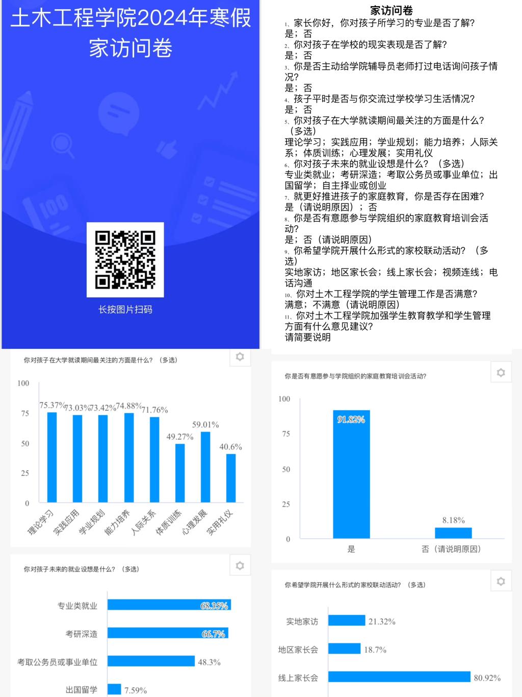 寒假以来,多宝官网土木工程学院多措并举、立体组网,持续推进家校联动工作,充分发挥学院领导班子成员、班主任(学业指导教师)、辅导员等的积极性、主动性和创造性,灵活选取实地走访、网络家访和电话交流等形式,结合各年级学生特点和成长实际分别召开家长会,并围绕课业评估、关注热点、就业指导、满意度测评等内容开展问卷调查,依托精准的数据支撑和贴切的指导帮扶来提升家校教育联动质量。