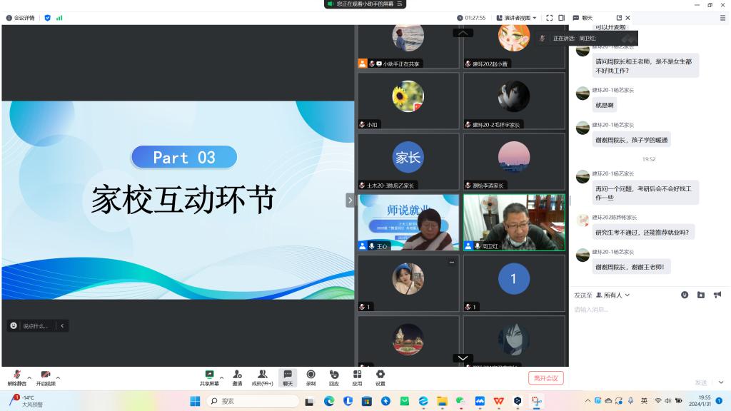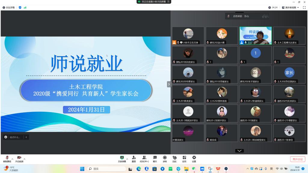 2月1日,多宝官网土木工程学院“家校共育,共促就业”家长会于线上召开,学院院长周卫红教授应邀出席并围绕职业生涯规划和就业指导等内容展开宣讲,2024届毕业班辅导员、全体毕业生及家长参加会议。